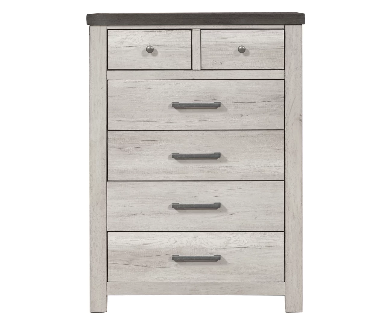 The Riverwood storage chest has the look and feel of wood, executed in a durable resin laminate. A dark top contrasts with the lighter tones for interest and a modern farmhouse appearance. The chest features two small drawers and four large drawers, offering plenty of storage for your wardrobe, linens and beyond. The chest works perfectly for the master bedroom, for a kid’s room or a welcoming guest room.