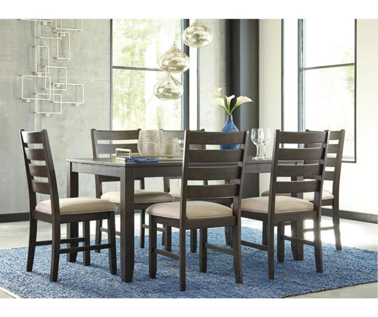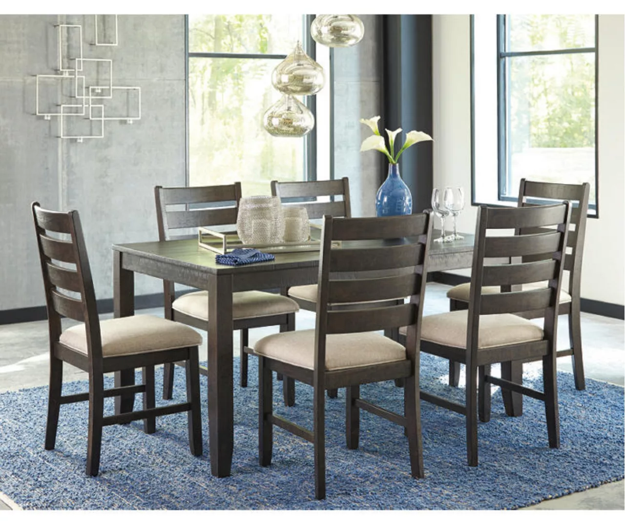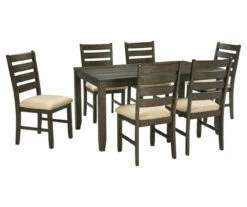 You love a clean and contemporary look—so long as it’s warm and inviting. With that in mind, this dining table set serves your sense of style beautifully. “Rough sawn” style finish with a hint of weathered charm tantalizes with a mood of relaxed elegance. Sumptuously upholstered seats in a neutral, textural fabric make the experience complete.
