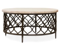 Substantial in size yet delicate in appearance, the Roland cocktail table features a white stone top with a bronze hourglass metal fretwork base. Its beautiful combination of size and grace is sure to leave a lasting impression for your guests and household.