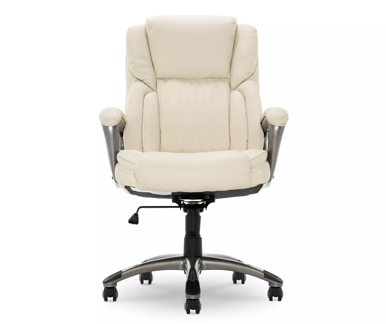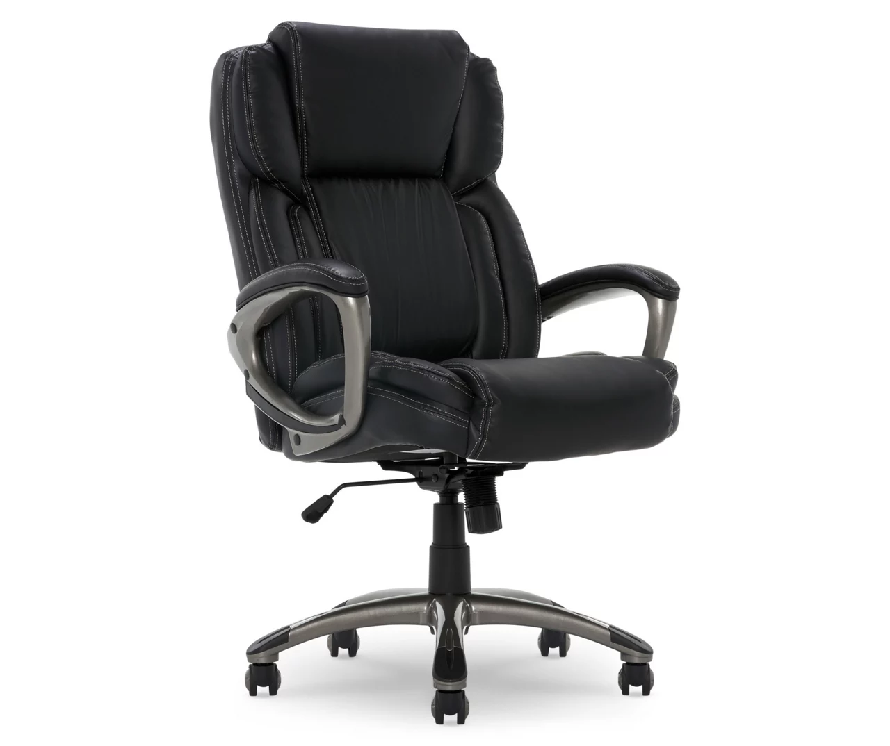 Bring relaxation to your busy workday with the Serta Executive Office Chair. Serta kept comfort in mind while designing this desk chair with luxurious layered body pillows, a contoured lumbar zone and padded armrests for all day ease and exceptional support during long periods of sitting. The waterfall seat edge reduces pressure on the back of the legs and increases circulation, which helps decrease fatigue while seated. The ergonomic office chair features both recline and seat-height adjustment settings, allowing you to find your optimal seating position. The heavy-duty painted base with scuff-resistant foot pads is designed for long-lasting, reliable use. This desk chair is upholstered in supple bonded leather with contrast stitching for comfort and style in any workspace.