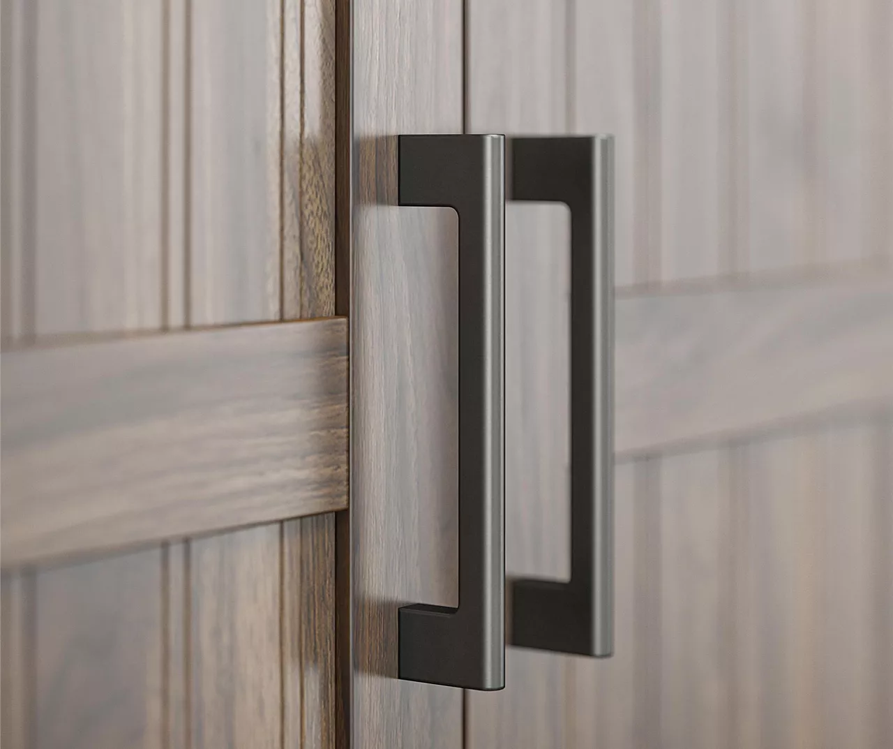 - Traditional framed doors with wainscoting and frame in a Columbia walnut finish