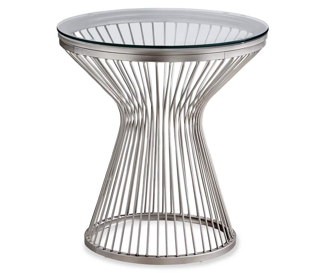 For a statement in contemporary elegance, furnish your home or office with this stunning accent table. The tempered glass top holds a lamp and drinks with room to spare, while the hourglass wire base adds a wow factor to interior décor. Use it as a side table next to your couch or as a chic nightstand in the bedroom.