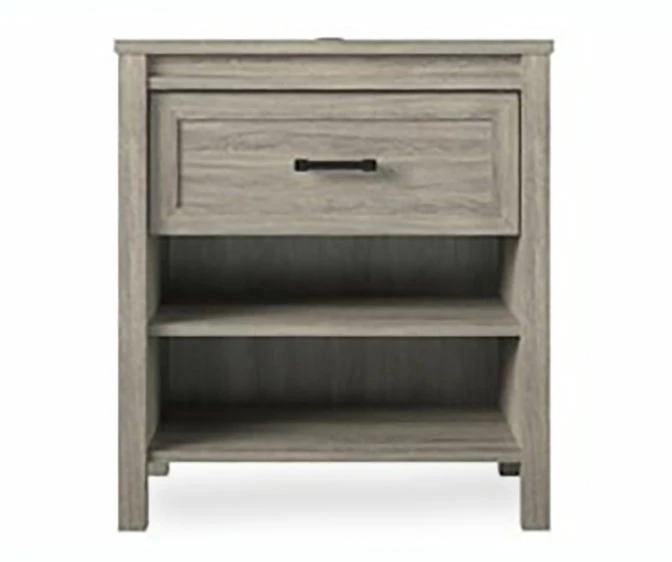 Organize your bedside with the Ameriwood Silverton nightstand. The beautiful gray woodgrain finish on the laminated MDF and particleboard can easily fit into your existing décor. Store away smaller items like glasses, cords and stationary in the convenient drawer. The lower two shelves, one adjustable, are perfect for books and magazines for nighttime reading. The top surface features a USB hub with two USB ports to make charging your phone or other electronics easy.