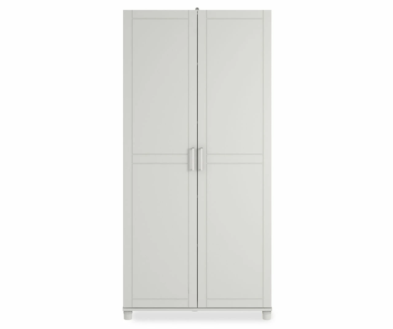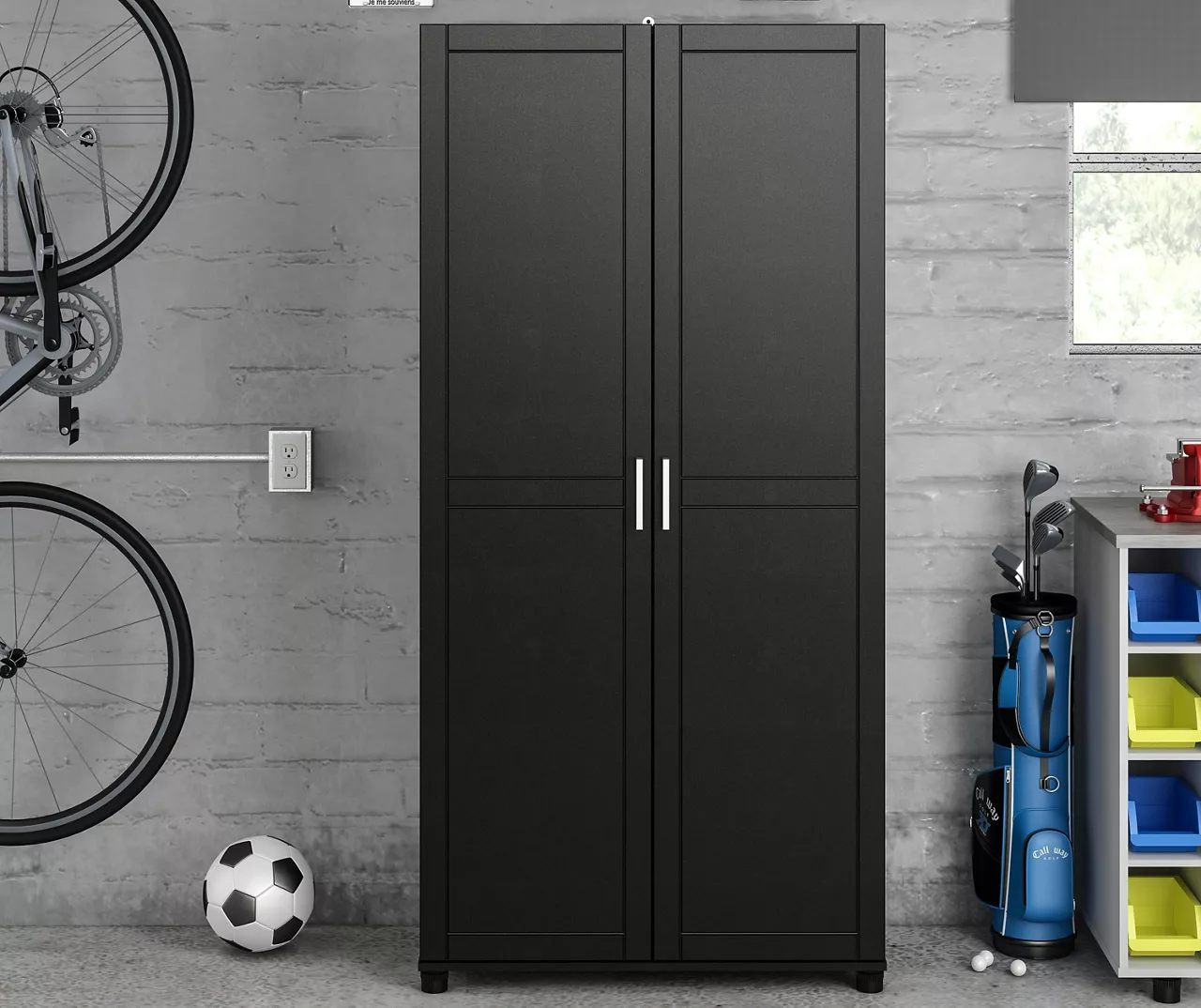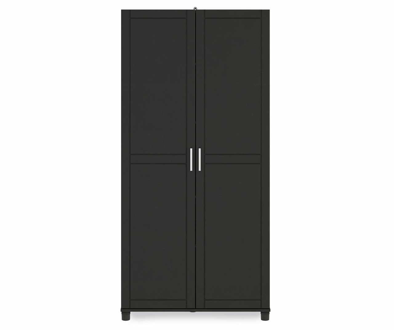 Add extra storage space to any room in your home with the System Build Evolution Selden 36” Utility Storage Cabinet. Made of laminated MDF and particleboard, the water resistant black finish on the shaker style doors is easy to clean so the Cabinet can be used anywhere. The interior of this Cabinet features five shelves, three of which are adjustable, allowing you to customize your storage for both small and large items. Store and organize anything from office supplies to cleaning supplies and even kitchen pantry items. Soft close hinges are adjustable and prevent slamming doors. The adjustable feet make keeping your Cabinet level on uneven floors simple.