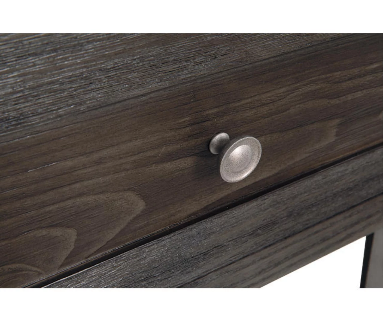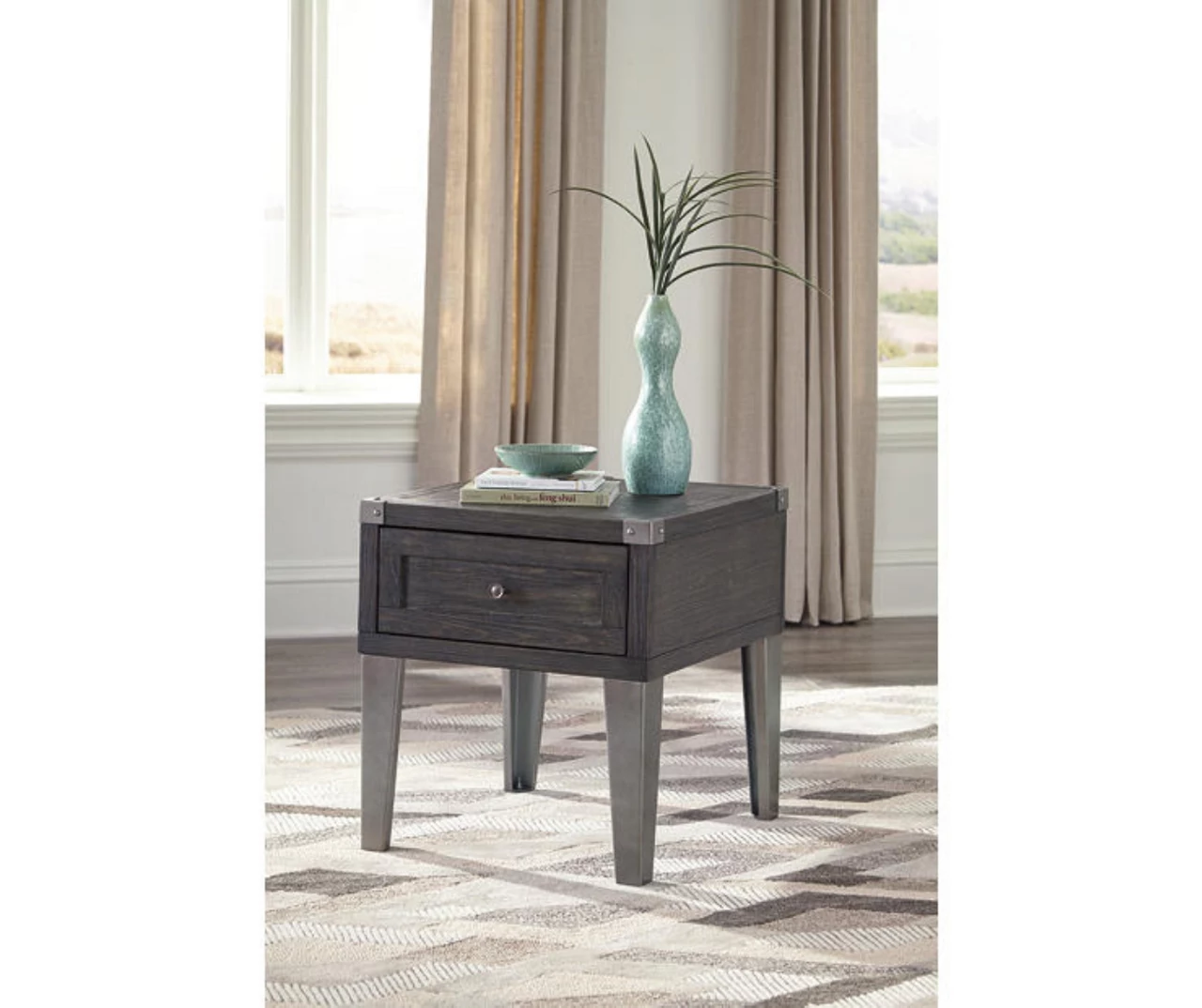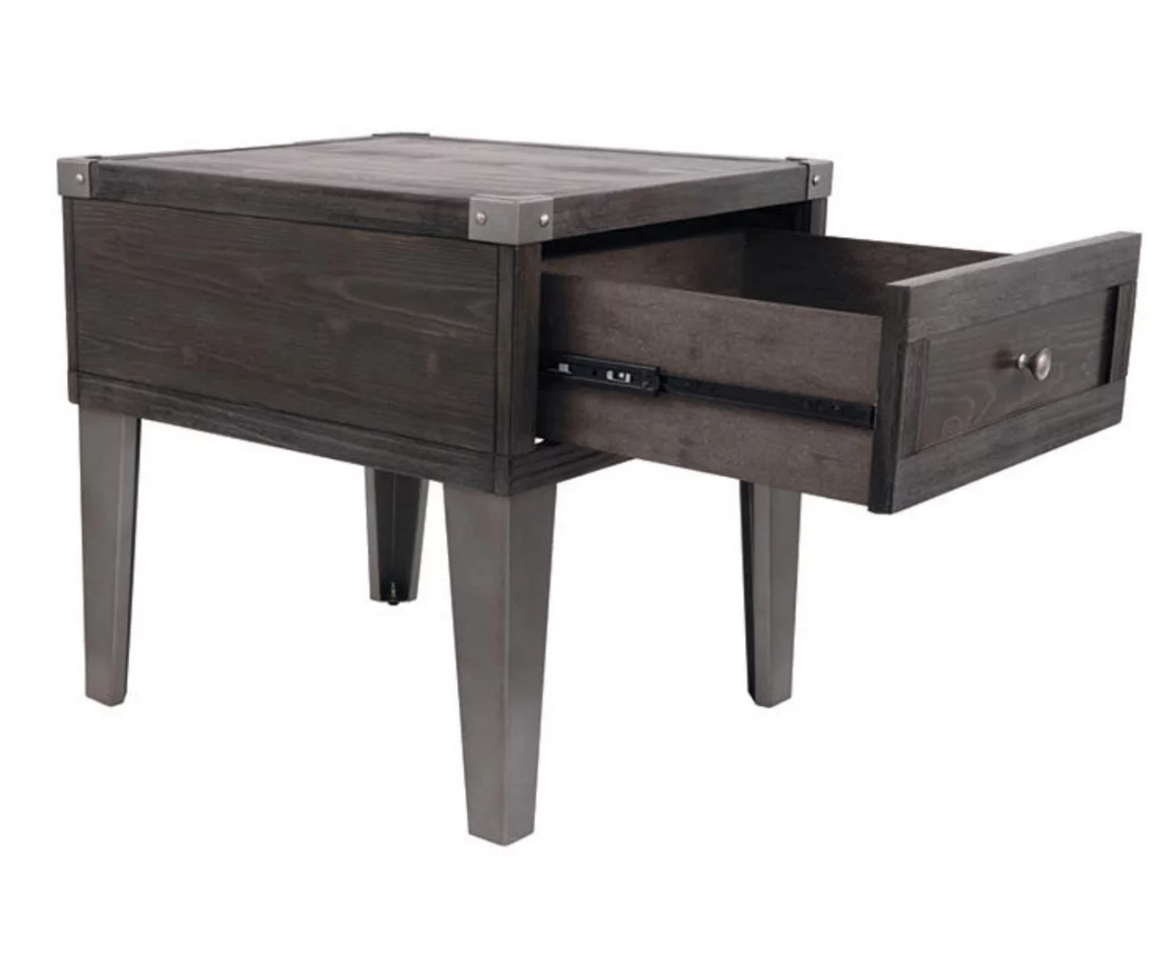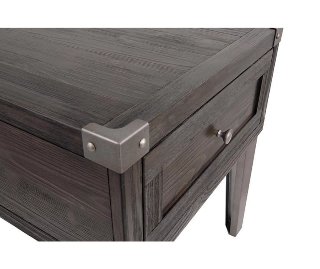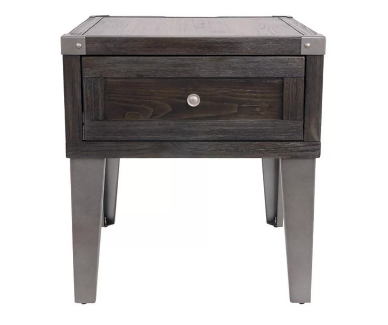 Take a stance for rustic-industrial style with this mixed material end table. Weather-washed pine wood and veneers are contrasted with canted metal legs and corner bracket accents for a uniquely chic merger of earthy beauty and contemporary flair. Power plug-ins and USB charging ports mounted on the back add practical function to great form.
