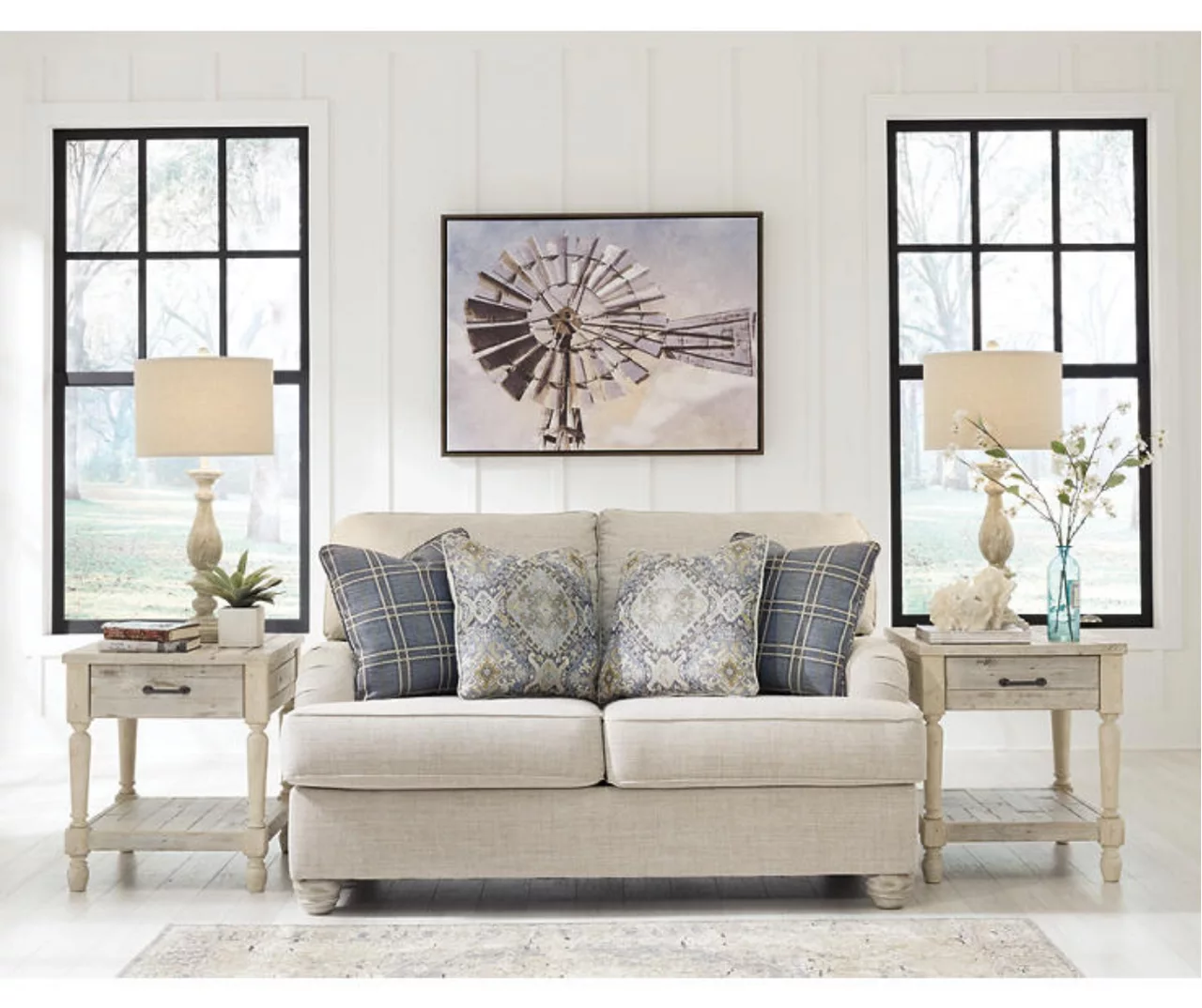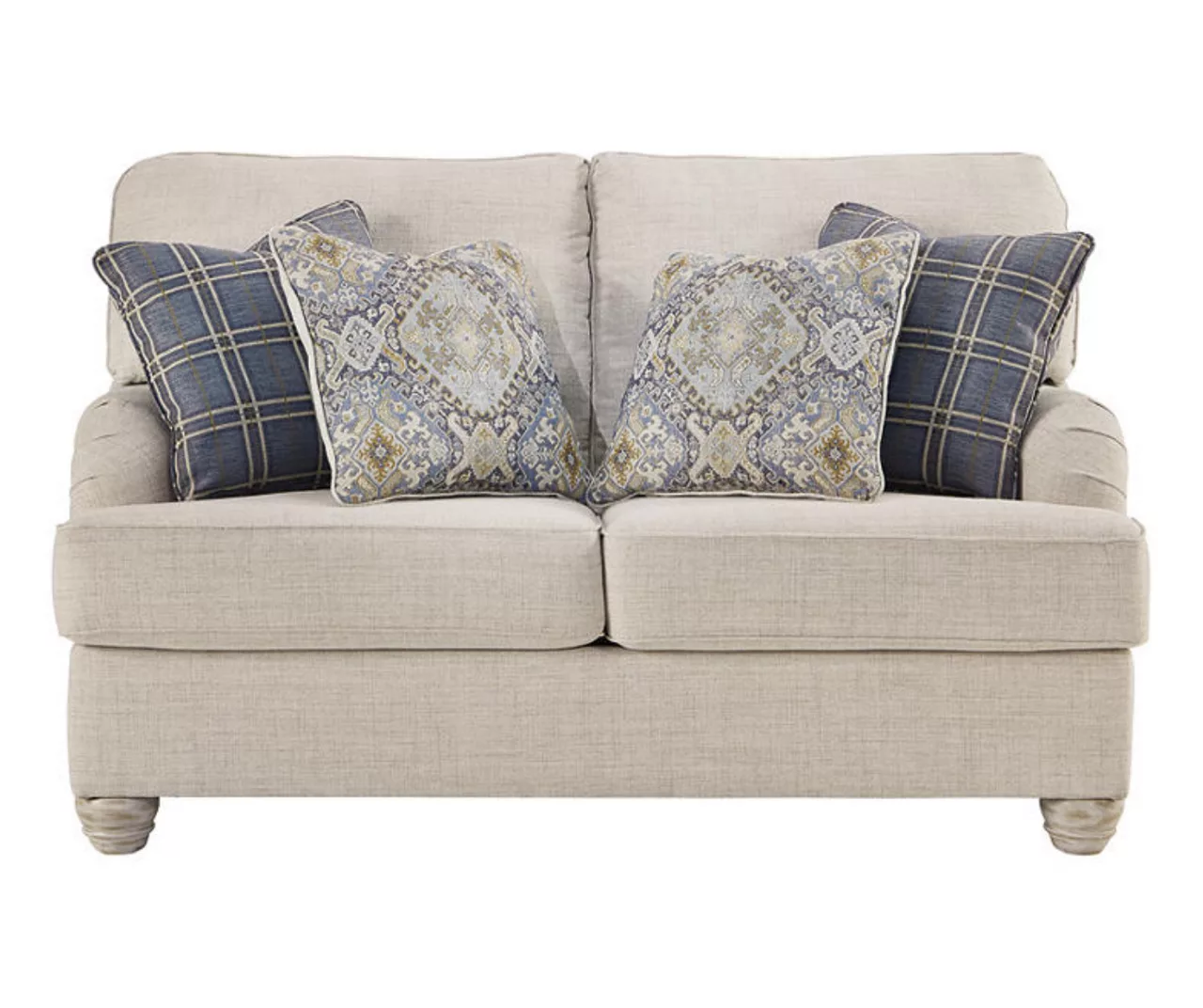 Don’t be shy—take a seat on this farmhouse-style loveseat. Dressed in a modern and relaxed linen-weave upholstery, it’s a luxurious complement to rustic accents with its light and airy palette and elegantly turned feet. Adorned with the plaid and patterned toss pillows, it’s a picture-perfect finish to any shabby chic or countryside living room.