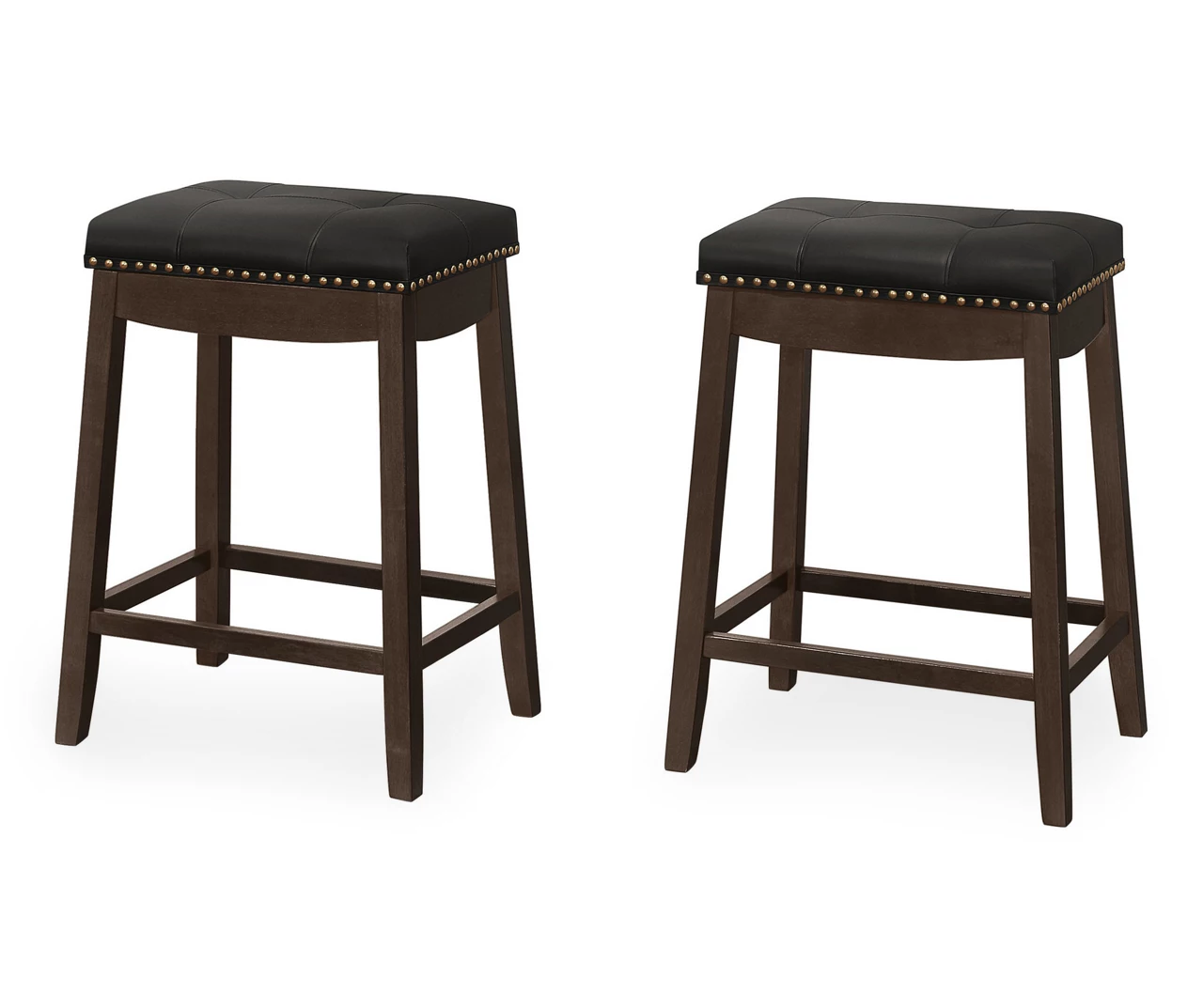 Traditional design details give these barstools a timeless style. Upholstered in a black leather-look fabric, the rectangular seats feature thick cushions with biscuit tufting that enhances the soft feel of the padding. Nailhead trim in a brass finish around the seats and curved aprons underneath further add to the classic, pub-like appeal of these counter-height chairs. Solid wood legs provide stability and are in a rich, dark-brown espresso finish, while footrests are ideally positioned to relax your feet. Sold as a set of two, these stools have a space-saving, backless design that allows them to be tucked neatly underneath a kitchen island or counter-height table when not in use.