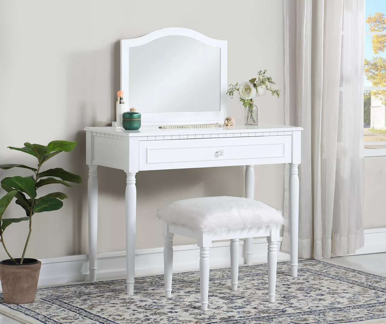 Get ready for the day in elegance at this vanity table set. A luxurious silver finish accents the tabletop, turned legs and matching frame stool as a white faux fur adorns the seat cushion. A single mirror helps with hair styling and makeup application as a large drawer, fitted with a crystal drawer knob, offers concealed storage for your items.