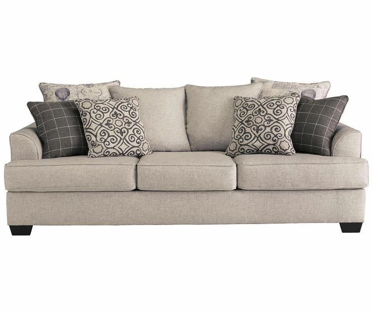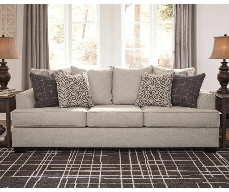 For the style enthusiast on a mission, the Velletri sofa takes a unique approach to design. Two back cushions flaunt a vintage-inspired “Paris” script. Throw pillows continue the charm with gray-infused scroll and plaid patterns. Flared arms and neutral hue lend to transitional appeal. Covered in a luxurious linen-like chenille, its softness and luxurious comfort will keep you coming back.